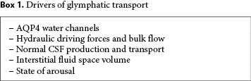 From the strong premise that the glymphatic system is involved in brain waste clearance and has been documented to be less efficient in the aging rodent brain [5, 8], and in transgenic mouse models of AD [9], it becomes important to understand the controlling forces. As discussed, continuous CSF transport through brain parenchyma is critical for the glymphatic system’s ability to transport and drain waste solutes. Thus, any condition that affects CSF transport will also interfere with solute transport via the glymphatic system. Although the glymphatic system consists of multiple structural and functional components (Fig. 1), it is viewed as a “single waste processing unit.” Anatomical and physiological factors which are implicated in glymphatic pathway transport and brain waste clearance are likely to include: (a) perivascular AQP4 water channels, (b) hydraulic forces associated with arterial pulsation [12, 22], respiratory effort, and body position [21], (c) normal CSF production and transport, and (d) state of arousal [7] (Box 1).